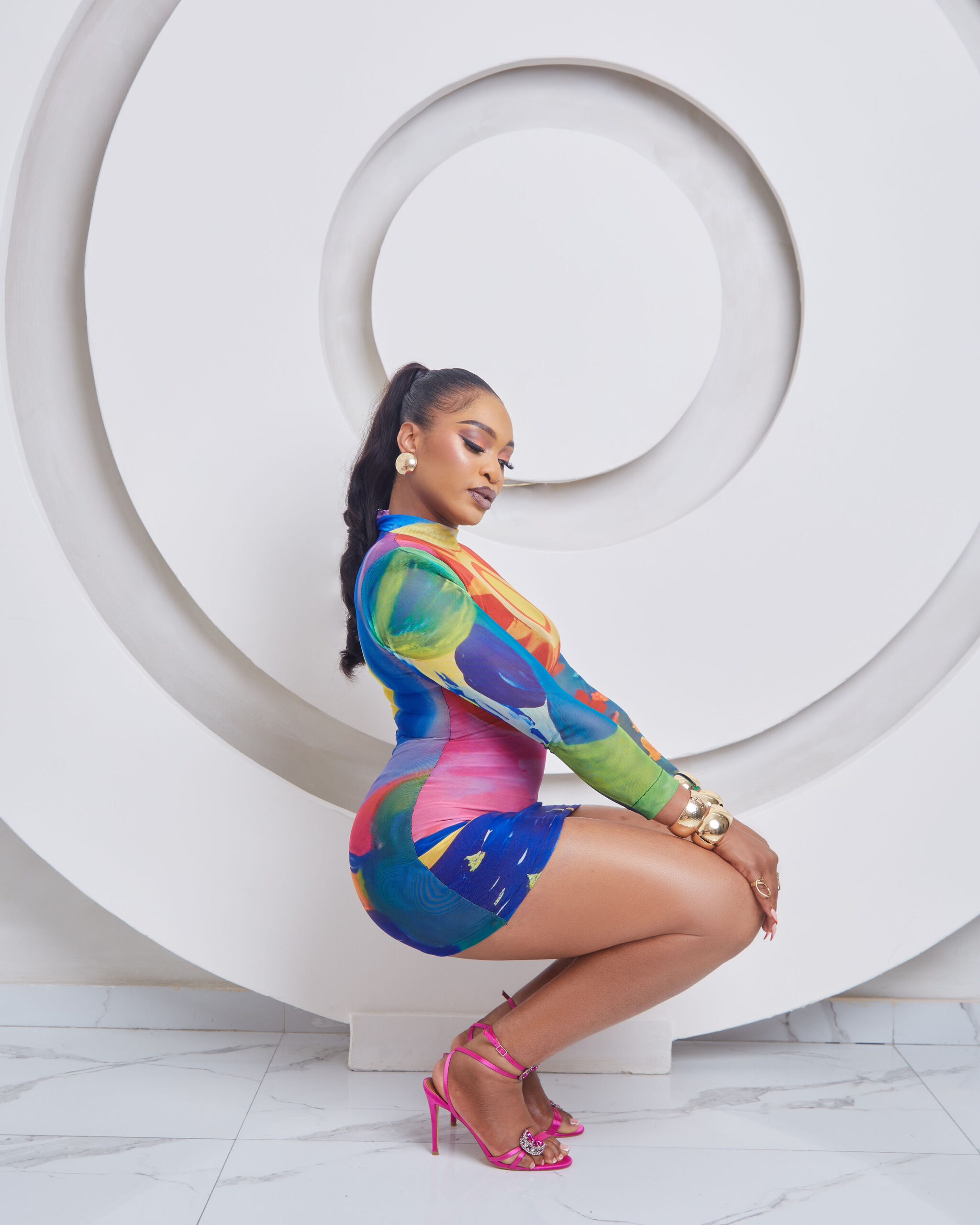 A fully lined statement mesh mini designed to hug, sculpt, and stand out. Featuring the signature Cosmic Motion print with bold celestial elements and fluid colour play, this dress delivers high impact in a sleek, body-skimming silhouette. Perfect for nights out, parties, and confident entrances.