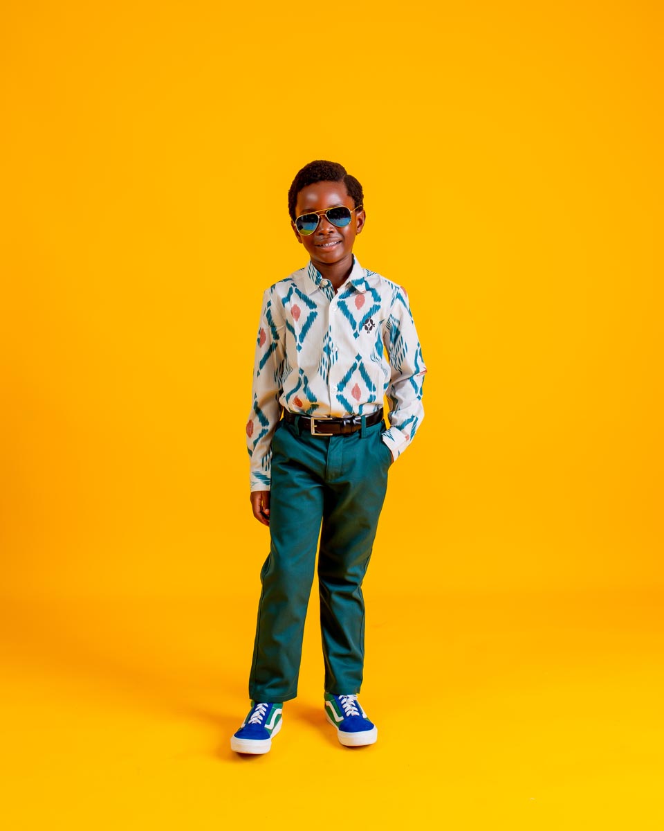 Smart with a splash of fun — this look features a crisp Oxford shirt with a bold geometric print, paired with classic forest green chino trousers. Perfect for special occasions or stylish everyday moments, it strikes the right balance between playful and polished.