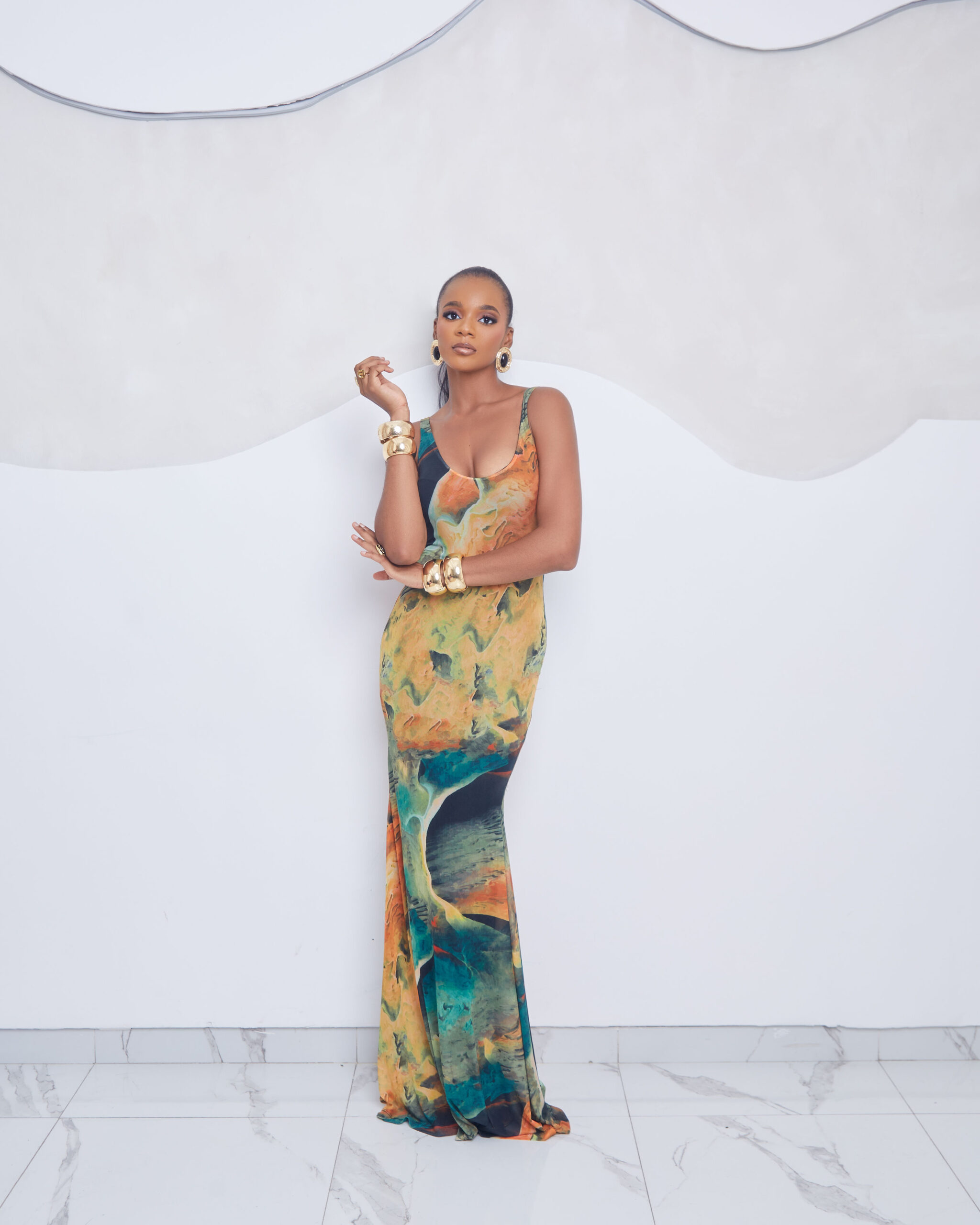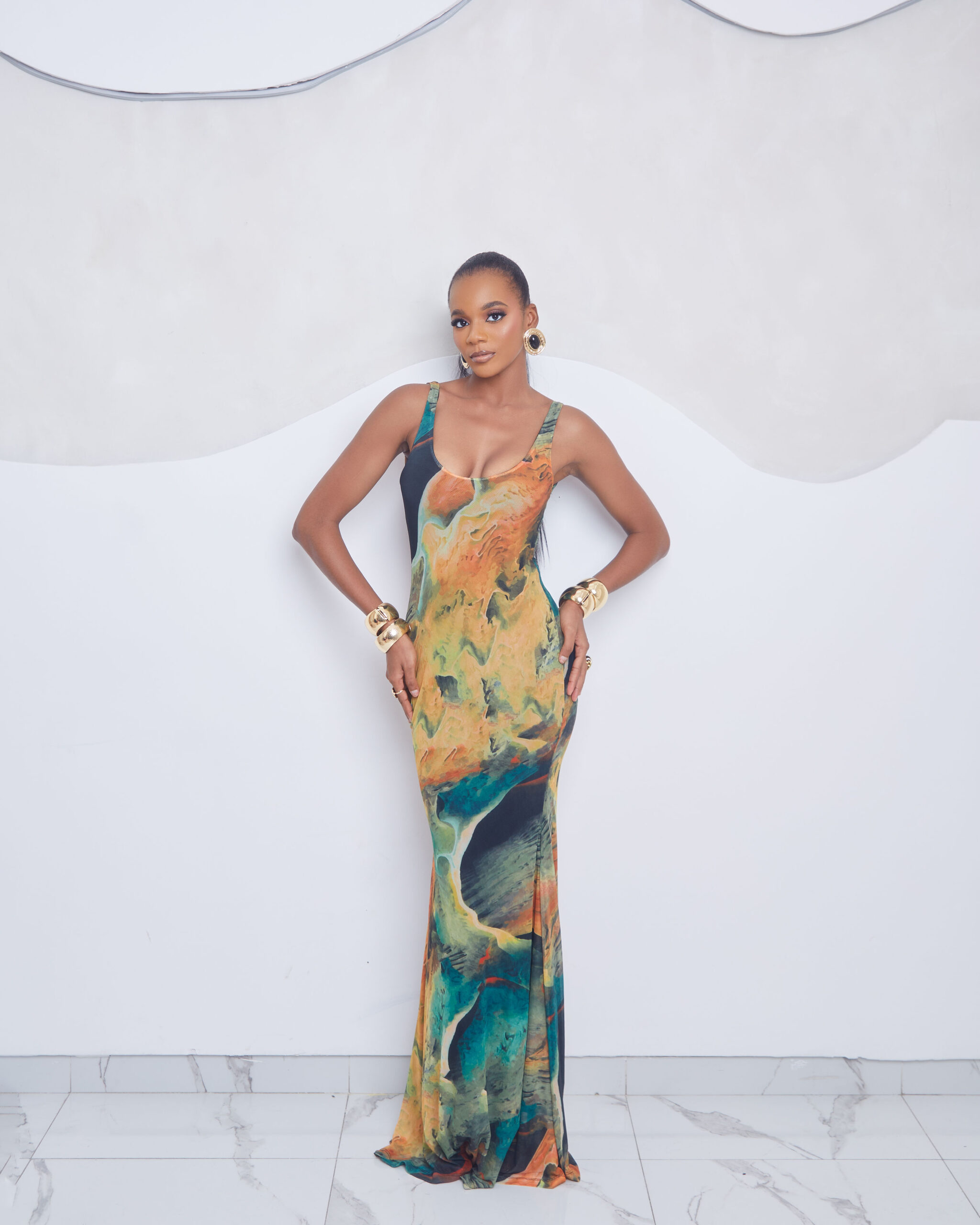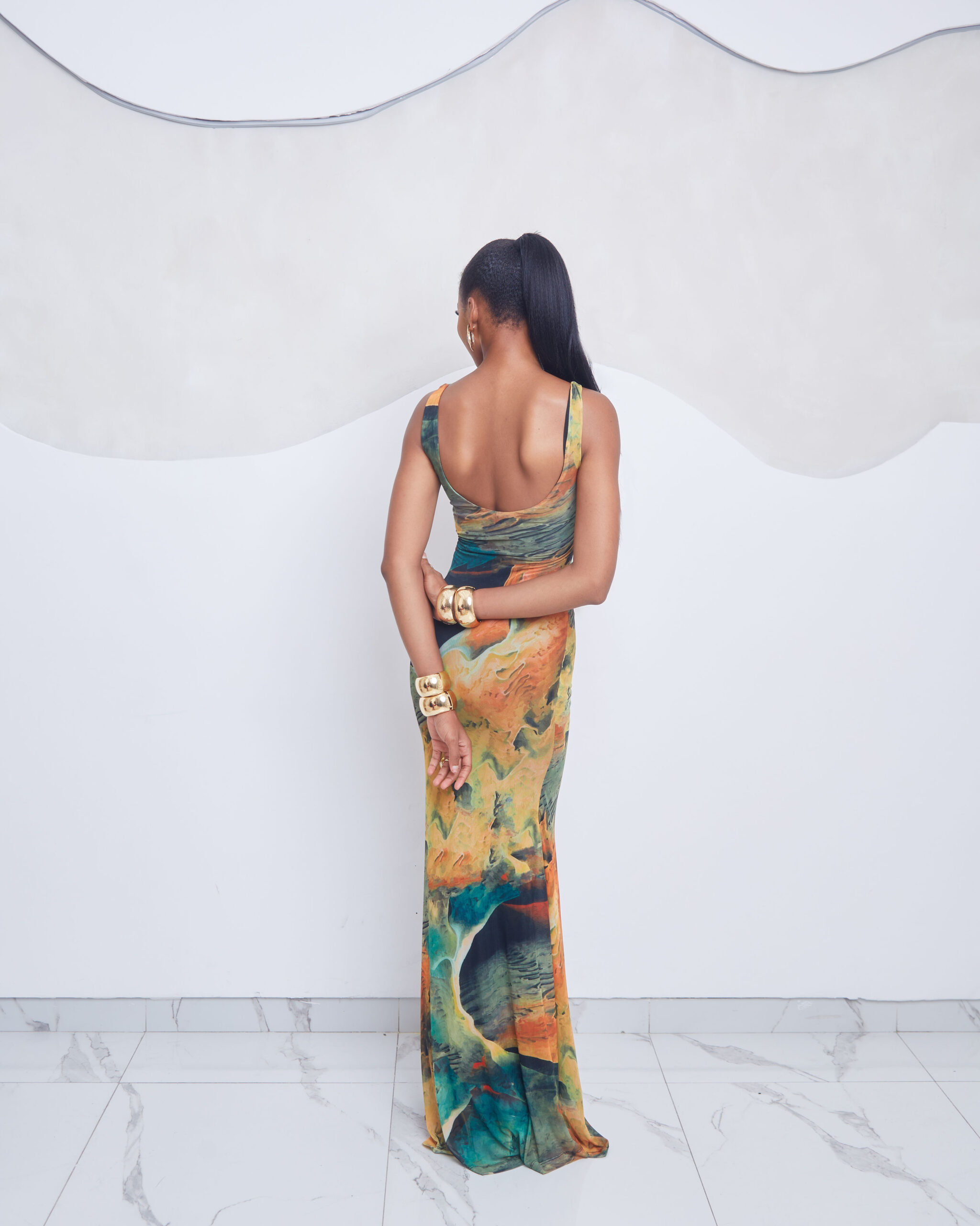 A fluid, body-contouring maxi crafted in lightweight mesh, featuring the Ochre Forest print; a rich blend of earthy greens, burnt orange, and deep ochre tones. Elegant, flattering, and designed to move with you.